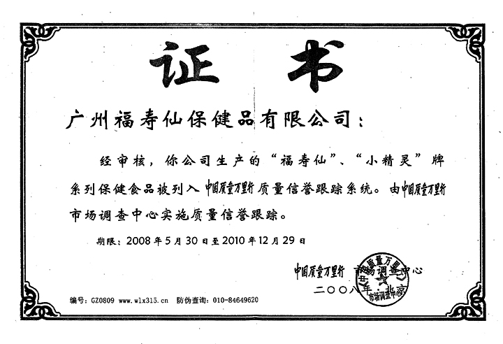 2008年福壽仙企業(yè)的“福壽仙”、“小精靈”系列食品被列入中國(guó)質(zhì)量萬(wàn)里行質(zhì)量信譽(yù)跟蹤系統(tǒng)